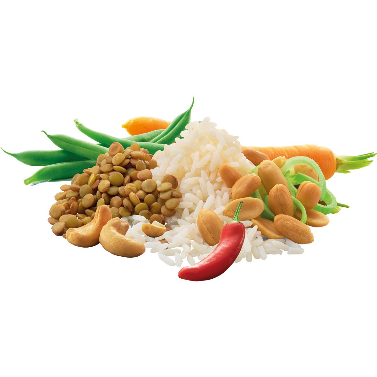 Vegetarische rijstmaaltijd met linzen, cashewnoten, sperziebonen, prei en wortel in een satésaus met nasigroenten en pittige kruiden.