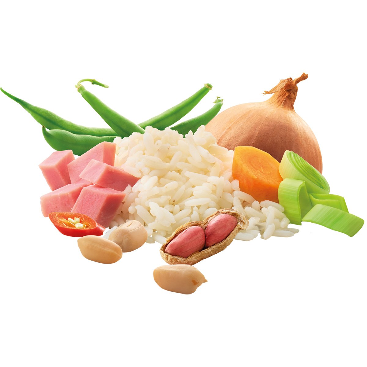 rijst, satésaus (32% pinda’s, suiker, tarwemeel, weipoeder, zout, gistextract, kruiden(knoflook, paprika, gember, laos, sereh, chilipeper,komijn), aromastoffen, maltodextrine, tomaat, ui, soja, zonnebl.olie, maiszetmeel), 6% ham (varkensvlees, tarwezetmeel, citroenzuur, anti-oxydant, rookextract, zout, conserveermiddel (E250)), nasikruiden (ui, 25% wortel, 10% prei, peterselie), palmvet, 2% wortel, 2% sperziebonen, zout, cayenne