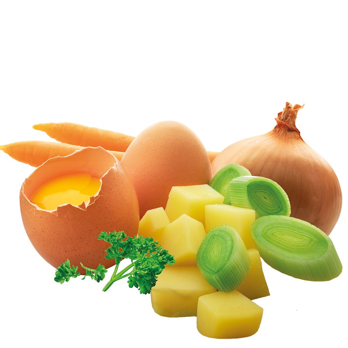 28% aardappelvlokken, 26% eipoeder, melkpoeder, kokosolie, 9% ei, 5% ui, aardappelzetmeel, palmvet, 4% wortel, 3% prei, zout, peterselie, peper