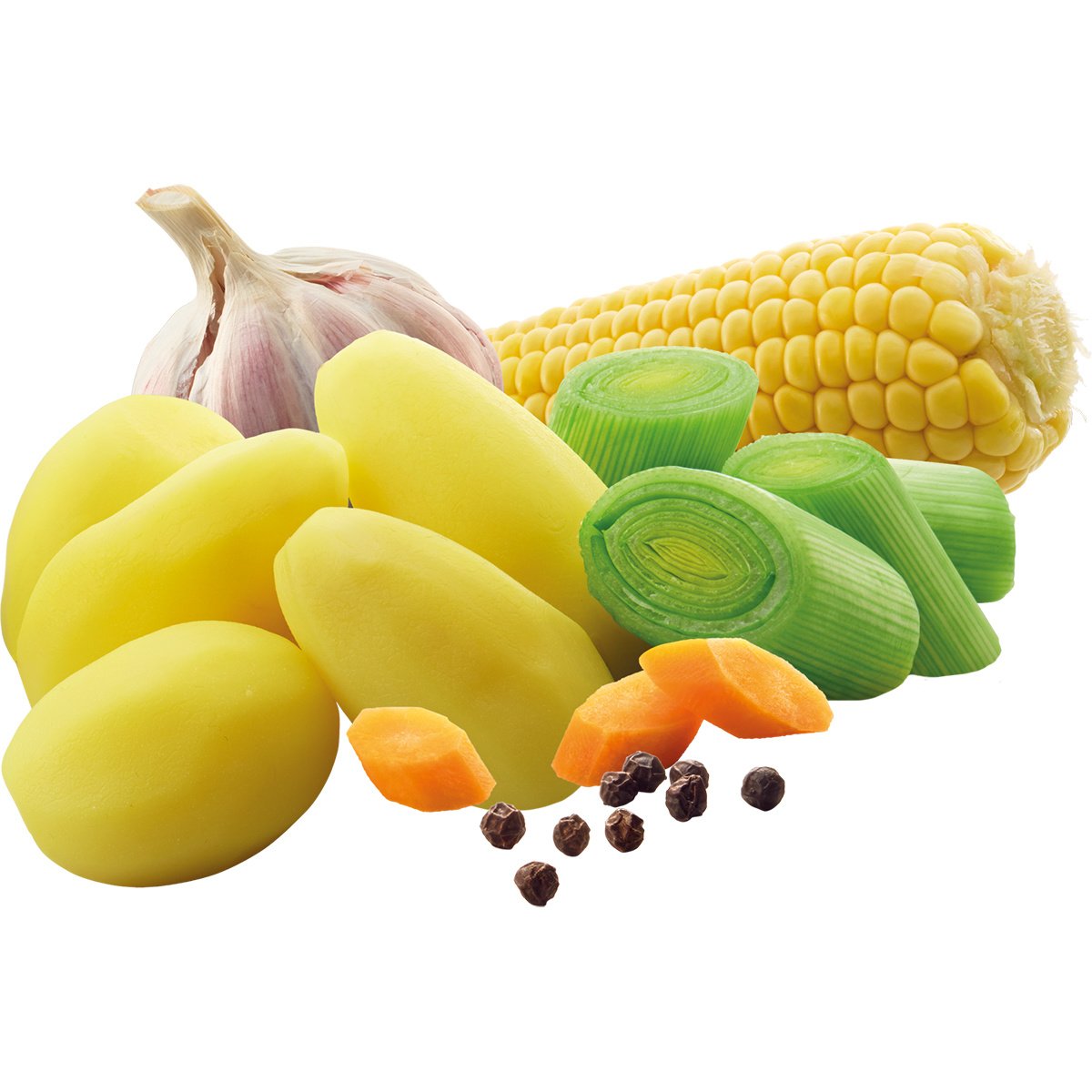 aardappelpoeder, palmvet, melkpoeder, kokosolie, soja, wortel, mais, bouillon (soja-eiwit, zout, glucosestroop, zonnebl.olie), prei, anti-oxydant (E223), bindmiddel (E471, E450), citroenzuur (E330), E551, knoflook, peper