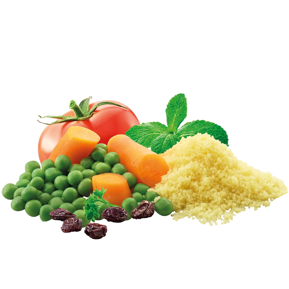 58% couscous, palmvet, 8% rozijnen, 5% paprika, 4% doperwten, 4% tomaat, ui, aardappelzetmeel, bouillon (soja-eiwit, zout, glucosestroop, zonnebloemolie), citroenaroma (maltodextrine), wortel, peterselie, peper, knoflook, munt