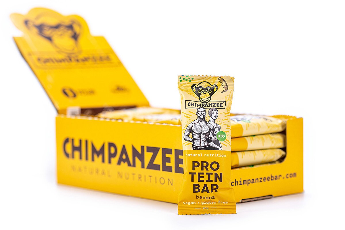 BIO eiwit reep met banaan. Ingrediënten: banaan 32%*, rijststroop*, rijst eiwit*,cashewnoten*, kokosolie*, cacaopoeder*, (*BIO-gecertificeerd product).