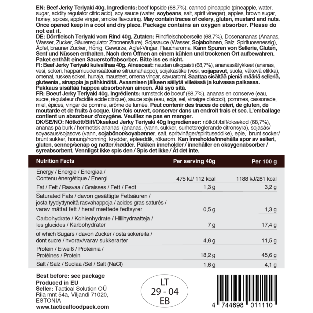 Beef jerky staat synoniem voor avontuur. Van Vikingen die de zeeën oversteken tot kampeertochten in de bergen, beef jerky is een draagbare brandstof die elke reis van stroom kan voorzien. Onze Teriyaki Beef Jerky begint met zorgvuldig geselecteerde magere stukken premium rundvlees, gekruid en langzaam gezouten om het immense smaakpotentieel te ontsluiten.