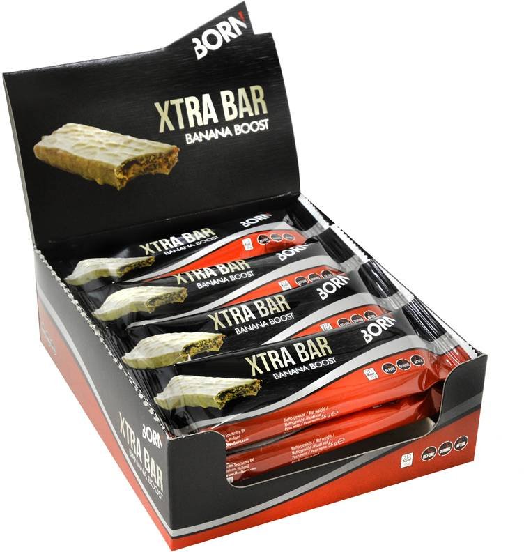 BORN XTRA BAR BANANA FLAVOUR heeft een heerlijke vulling van rijstcrisps, havervlokken, stukjes aardbei en banaan, omhuld met een yoghurtcoating. Met een mix van snelle en complexe koolhydraten geeft deze reep je snelle energie tijdens je inspanning, zonder dat je de man met de hamer tegenkomt.