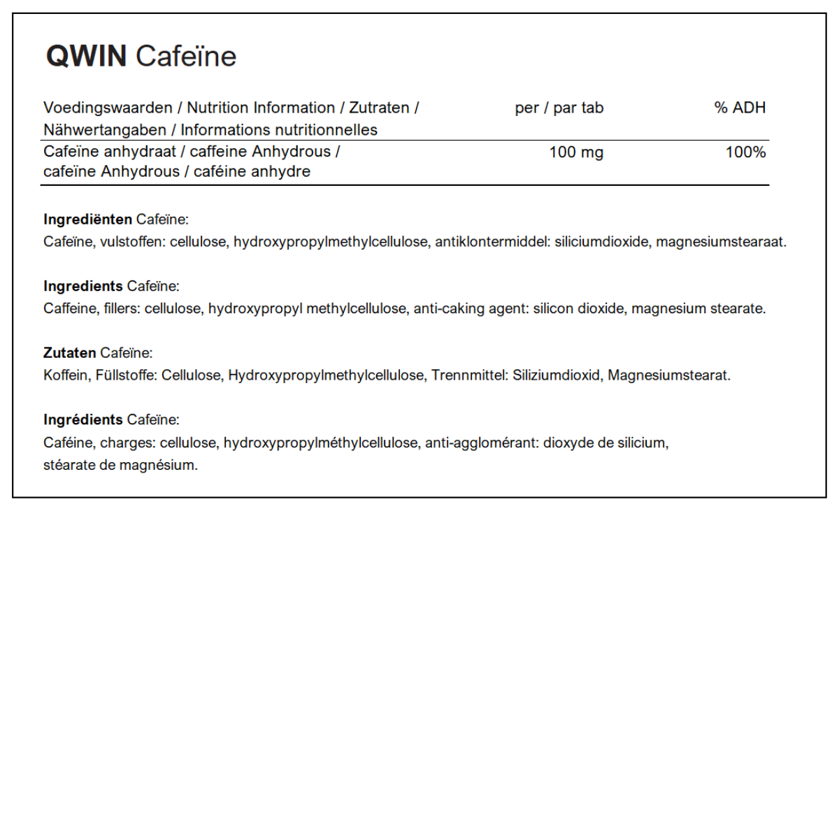 Ingrediënten: Cafeïne, vulstoffen: cellulose, hydroxypropylmethylcellulose, antiklontermiddel: siliciumdioxide, magnesiumstearaat.