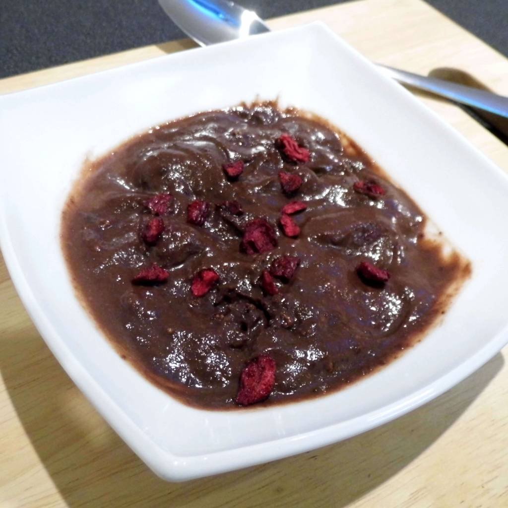 Een rijke chocolade mousse met haver en zure kersen. Goddelijk!