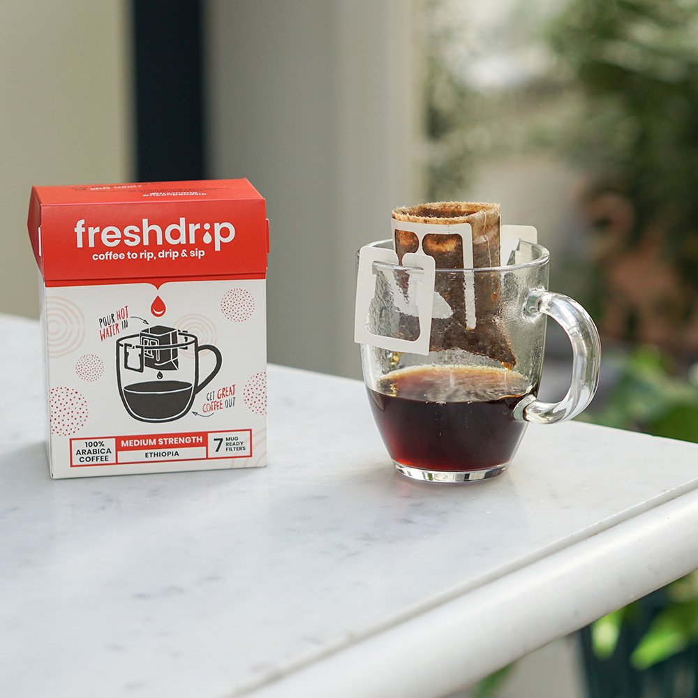 Elke Freshdrip bevat 10g gebrande en gemalen koffie waarmee je overal in slechts 3 minuten een verse kop filterkoffie kan zetten. Je hebt alleen heet water en je favoriete mok nodig. Handig, hé?