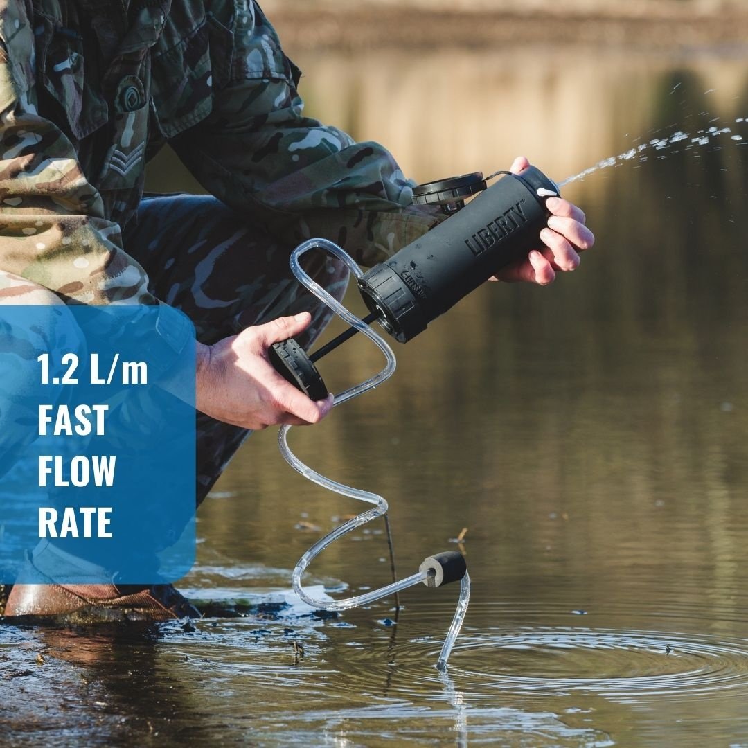 De LifeSaver Liberty™-waterzuiveringsfles is ’s werelds eerste en enige draagbare waterzuiveraar, een fles met een gecombineerde inline-pomp.
