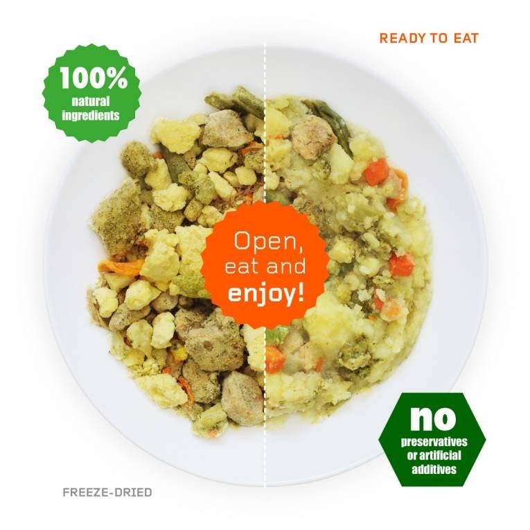 Varkenslende met aardappels en groente in een lekkere saus met dille. Koken voor vriesdrogen – LYO FOOD heeft een unieke technologie ontwikkeld, die is gebaseerd op het koken van maaltijden voor vriesdrogen – net als een normaal gerecht wordt bereid. Het resultaat is de echte smaak van een zelfgemaakte schotel. Dit is de reden waarom LYO maaltijden zo goed smaken.