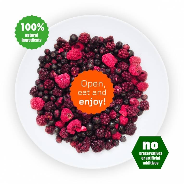 33% gevriesdroogde frambozen, 33% gevriesdroogde bosbessen en 33% gevriesdroogde zwarte bessen.