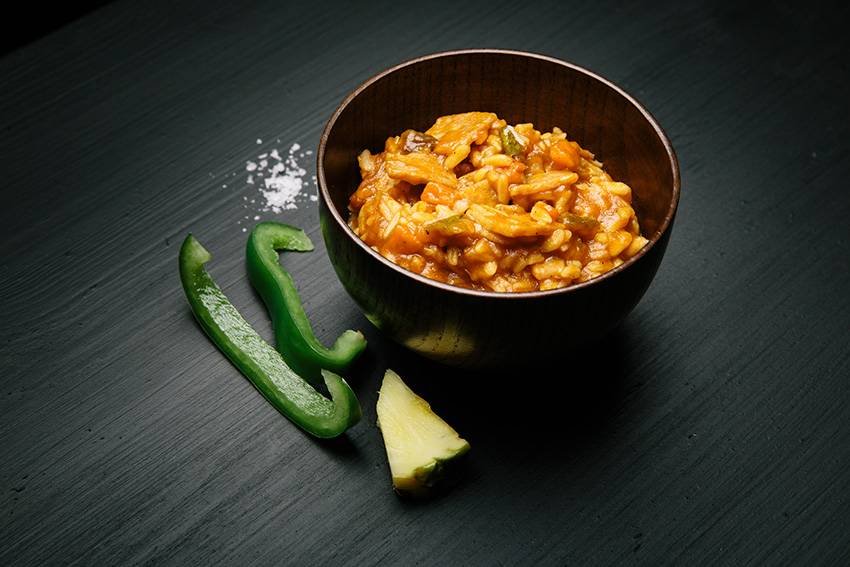 Rijst (32%), varkensvlees (varkensvlees (74%), varkensvet, aardappel vezels, zout) (20%), wortel, ui, tomatenpuree, koolzaadolie, paprika (5,7%), ananas (4,3%), maïszetmeel, suiker (2,4%), sojasaus, vleesbouillon, azijn (1,4%), kruiden, knoflook, gember, antioxidant (ascorbinezuur).
