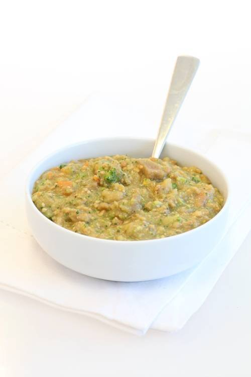 Aardappel, lam pate (lamsvlees, maïsmeel, zout), wortel, soja-olie, tarwebloem, ui, bloemkool, broccoli, room, selderij, vlees bouillon, zout (4,5 g), knoflook, rozemarijn-extract en kruiden.