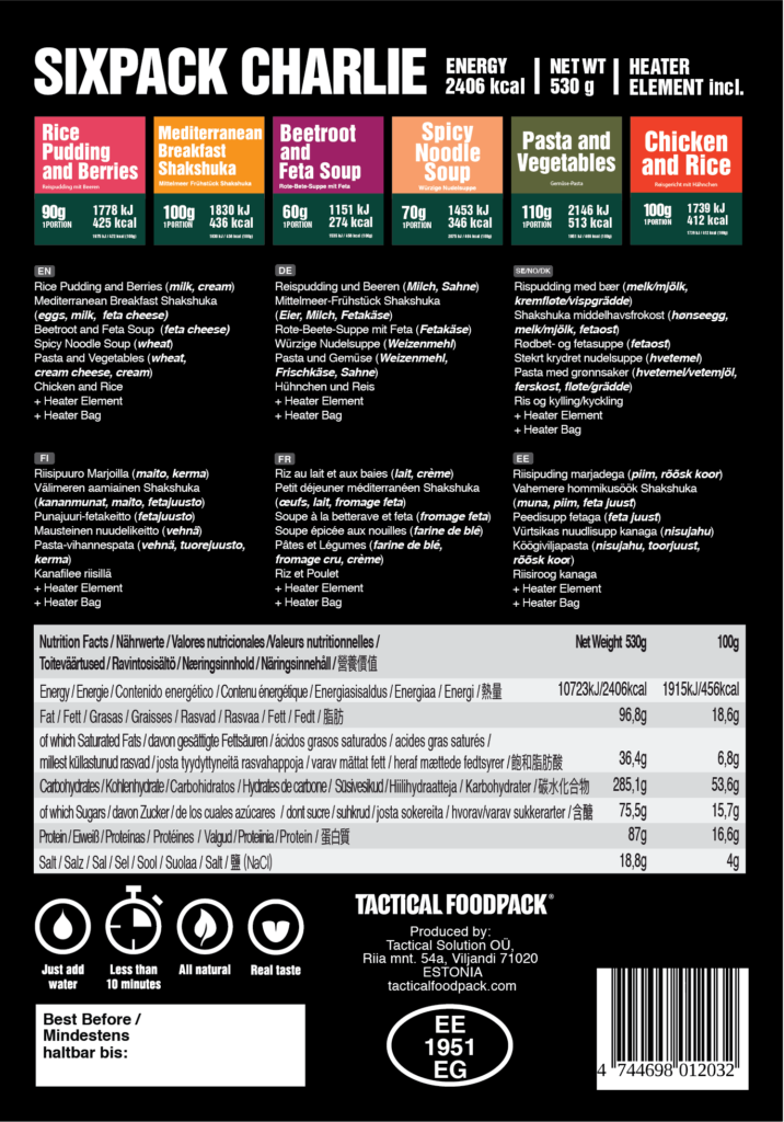 The third combo of Tactical Foodpack called Six Pack Charlie has a slightly smaller calorific value than the other combos, but contains still 6 different TF food packages.