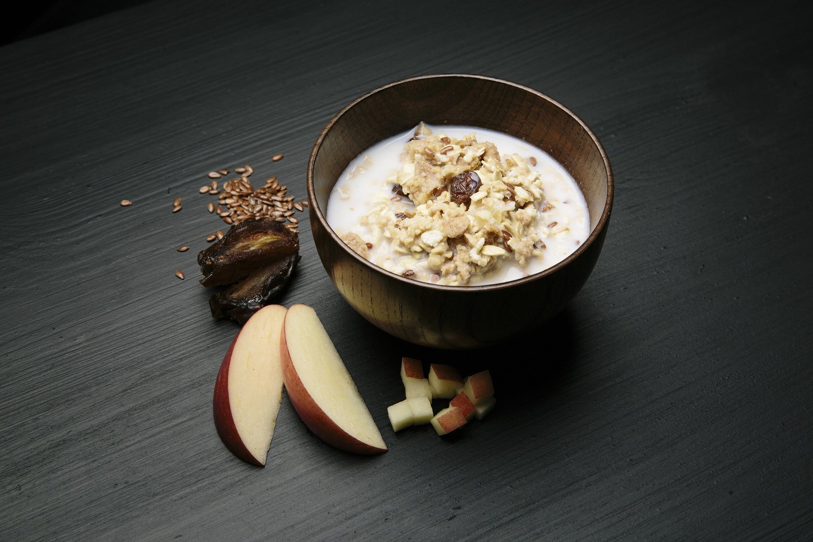 Muesli (havermout, rozijnen (14%), tarwevlokken (tarwe, zout), zemelen (maïsmeel, hele rogge, tarwezemelen, suiker, tarwemout, zout), lijnzaad (5%), dadels (3%) , appelstukjes (appel, suiker) (3%)) (60%), melkpoeder, soja-eiwit, suiker.