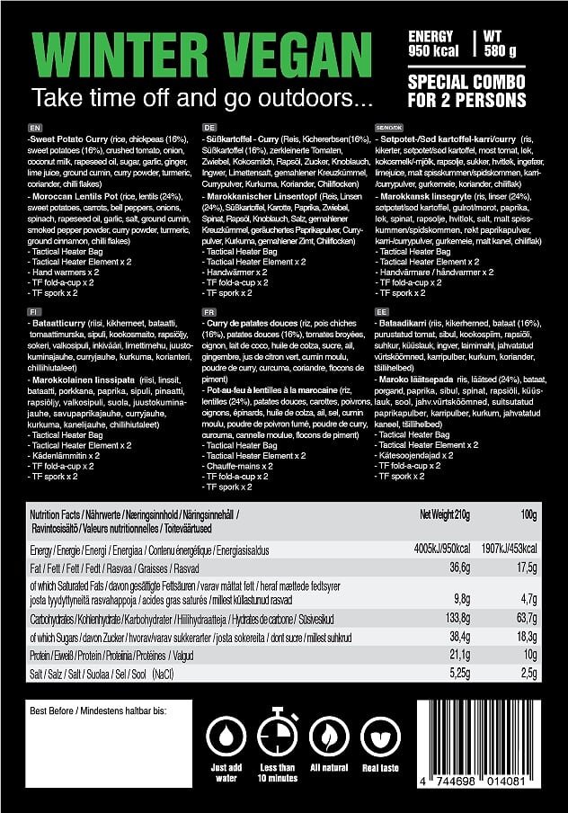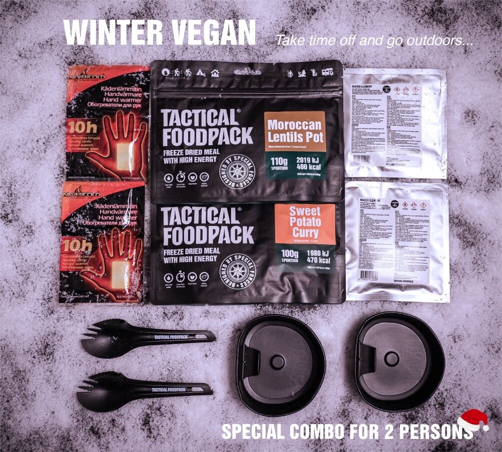 In deze perfecte en betaalbare geschenkverpakking vind je 2 maaltijden, 2 tactical fold-a-cup, 2 tactical sporks, 2 heater elements with a bag en 2 sets handwarmers.